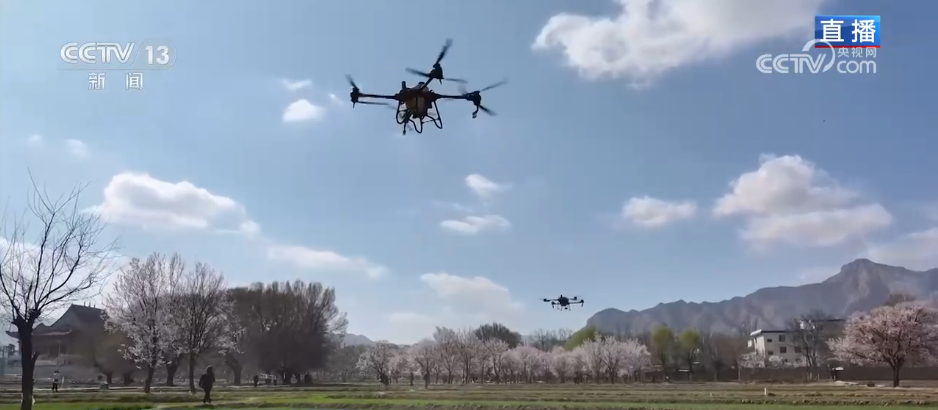 除了水利设施的升级,空中无人机正在麦田上空开展喷洒叶面水溶肥作业。以前施肥全靠人工,费时又费力。现在有了无人机,大大节省了劳动力。比起人工喷洒,无人机施肥减少用药量、喷洒更均匀,还能避免人工喷洒过程中对麦苗的踩伤,科技的加持让循化县的春耕春灌更高效、更智慧。