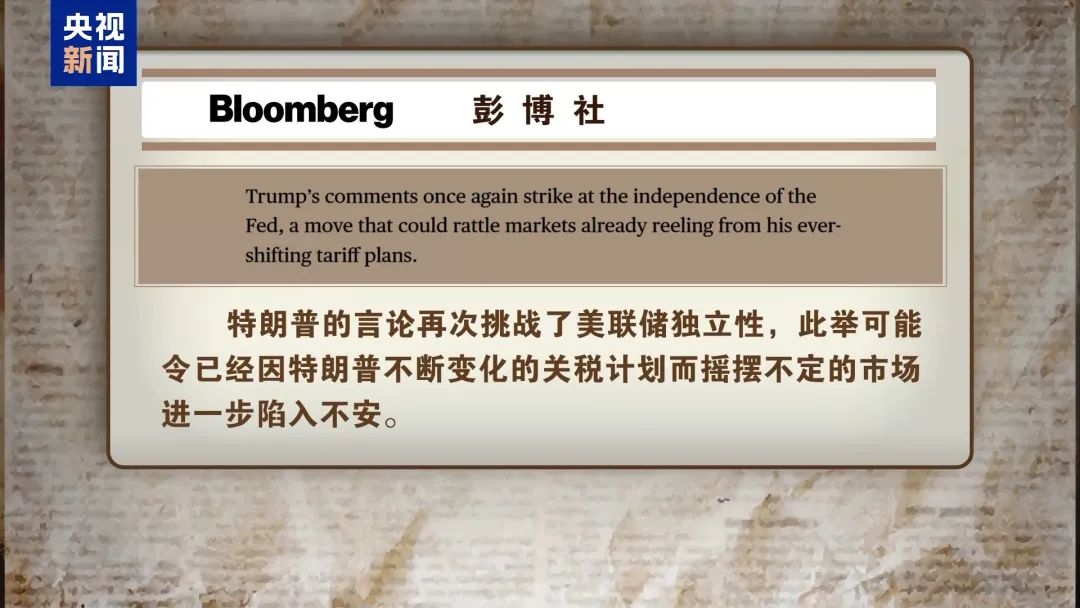 彭博社则在8日报道称,特朗普的言论再次挑战了美联储的独立性,此举可能令已经因美总统不断变化的关税计划而摇摆不定的市场进一步陷入不安。彭博社还指出,这位美国总统多次就是否解雇鲍威尔发出矛盾信号。上个月,特朗普公开说考虑解雇鲍威尔,其首席经济顾问称政府正在研究总统是否具备此权限——但特朗普随后又说无意采取行动。